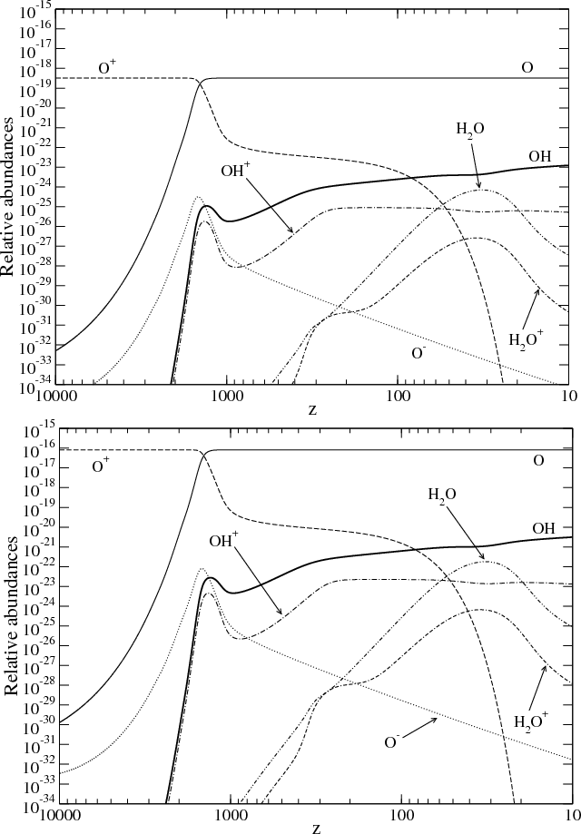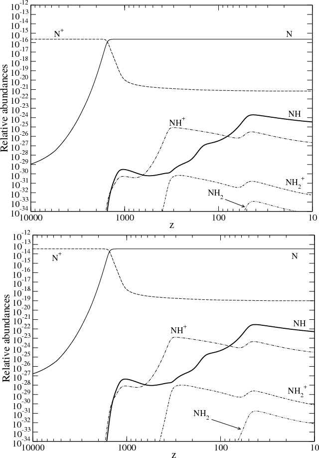 For similar arguments drawn from Figs. 3 and 4, we will start our calculations of the primordial chemistry of nitrogen and oxygen with the singly ionized nitrogen and oxygen ions at