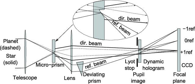 As previously described (Labeyrie & Le Coroller 2004; Labeyrie 2004), and shown in Fig. 1, the focal occultor in a Lyot coronagraph can be built in the form of a micro-prism deflector preserving most star-light to produce an off-set reference wave. It interferes with the direct wave in order to generate a hologram which is initially recorded in the pupil plane near the Lyot stop, and then exploited for nulling most starlight while preserving the planet's image formation. Depending on the focal ratios, the reference beam may intersect the direct beam at an angle of several degrees. We note
