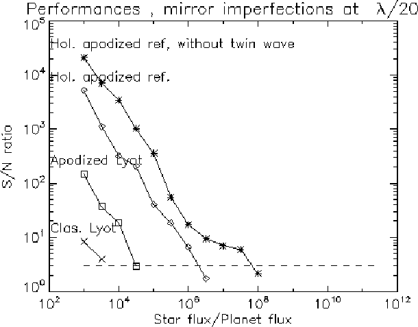 One can also improve the existing coronagraphs and erase the rings of the stellar point-spread function (PSF) by apodizing the pupil, for example using prolate functions (Aime et al. 2002; Soummer et al. 2003). Unfortunately, a large fraction of the light is absorbed by the apodization mask. The loss is avoided with an apodizing device (Guyon et al. 2007; Guyon 2003) using a pair of distorted mirrors to modify the light distribution across the pupil. With this loss-less achromatic apodization, exo-planets as faint as 10-10 can in principle be directly imaged.