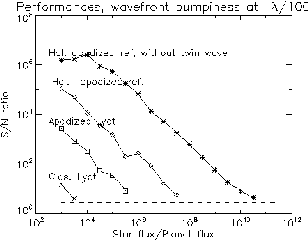 wavefront bumpiness, the planet detection limit is improved, in terms of star/planet flux ratio, from 104.5 to 107.9. In terms of photon noise, we found that the hologram improves the performance of the coronagraph if it is recorded with more than