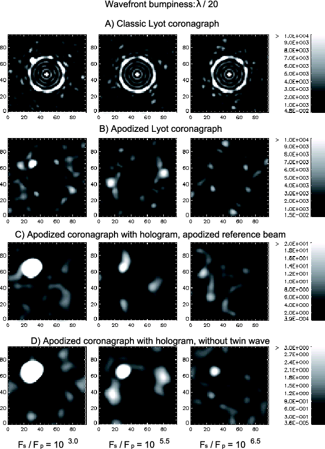 with the classical Lyot coronagraph (A); 104.5 with the apodized Lyot coronagraph (B); 106.2 with the hologram and apodized reference beam (C); and 107.9 after subtracting the twin wave (D). At