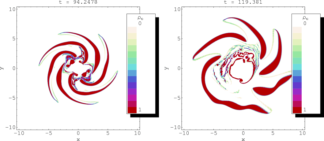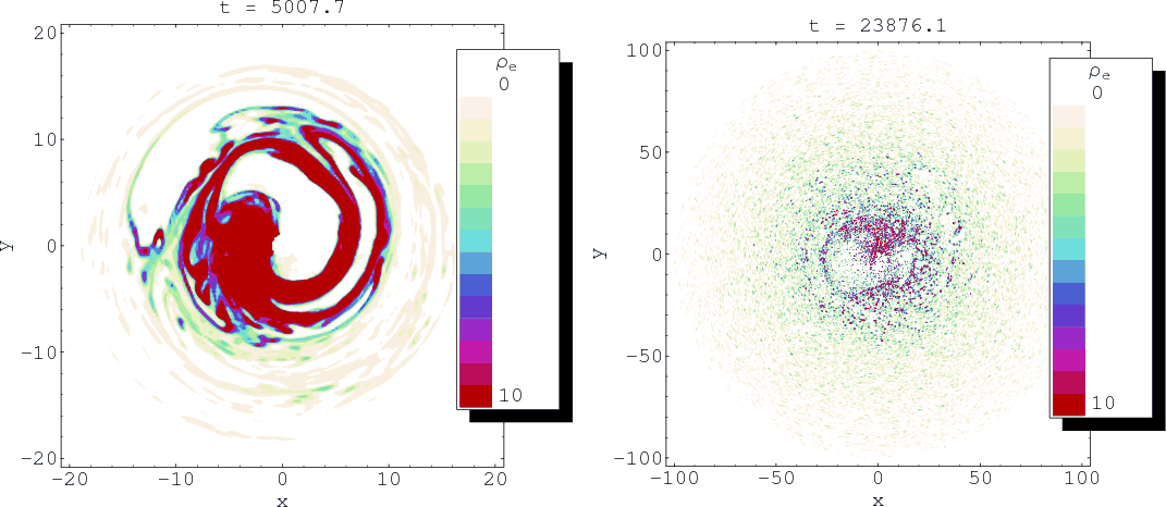 Numerical simulations of the non-linear development of the diocotron instability have been investigated by different authors. For instance, Pétri et al. (2003) used a numerical scheme similar to those used for MHD codes. This has the drawback of poorly treating vacuum gaps which eventually are created in the electrosphere. To better deal with these gaps, we decided to design a particle simulation code that does not suffer from the presence of vacuum. Particle-in-cell (PIC) methods have already been successful in investigating the diocotron instability (Yatsuyanagi et al. 2003; Neu & Morales 1995). Problems with injection have also been considered see for instance Bettega et al. (2007).