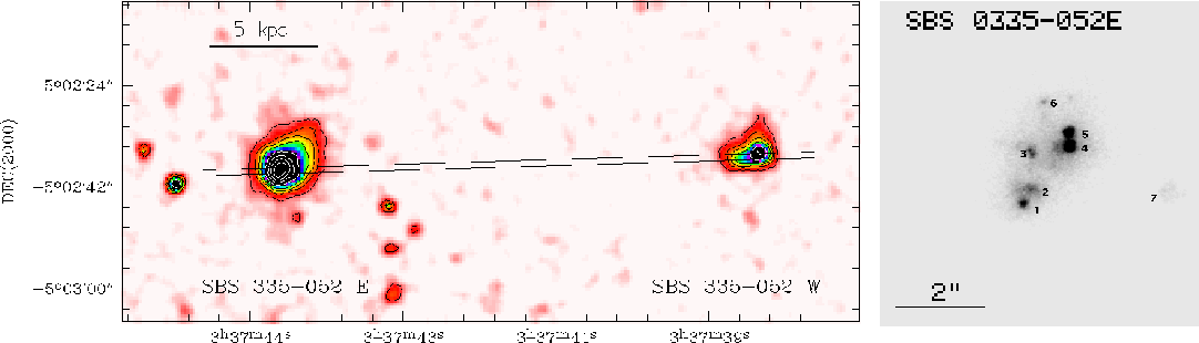Fig. 1 (right panel) following Thuan et al. (1997) and Papaderos et al. (1998). 2) Thuan & Izotov (1997) discovered evidence of stellar winds in the massive stars of SBS 0335-052E based on the HST UV spectroscopic observations of the brightest SSCs. 3) Vanzi et al. (2000) first detected near-infrared