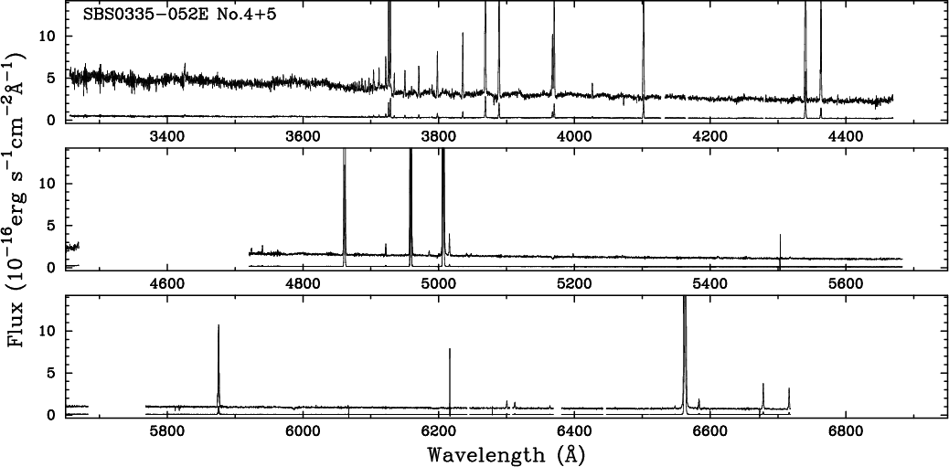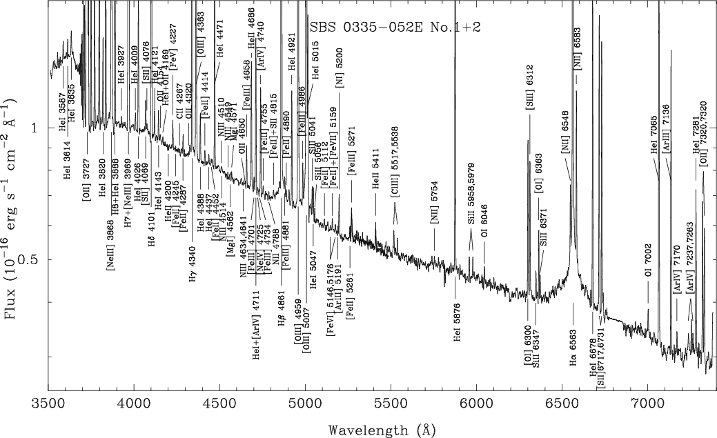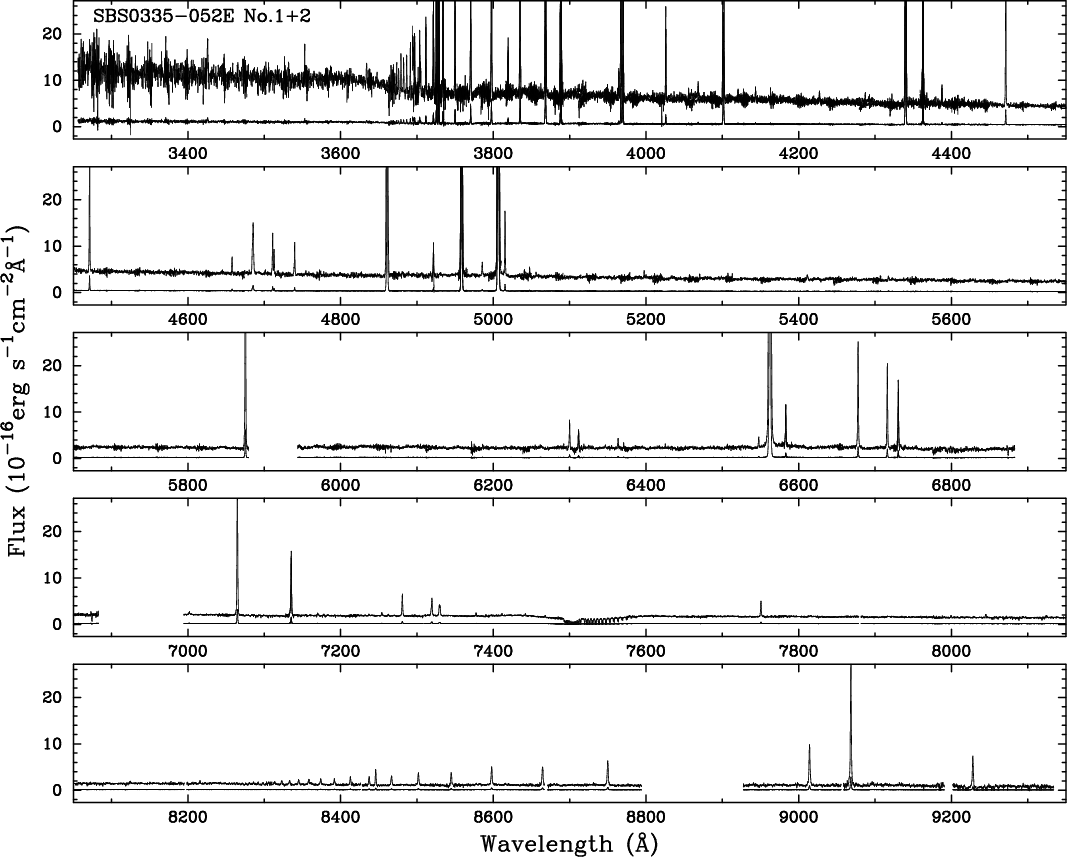 The FORS spectra of SBS 0335-052E and SBS 0335-052W were obtained on 10 September, 2002 with the FORS1 spectrograph mounted at the UT3 of the 8.2 m ESO VLT (ESO program 69.C-0203(A)). The observing conditions were photometric throughout the night.