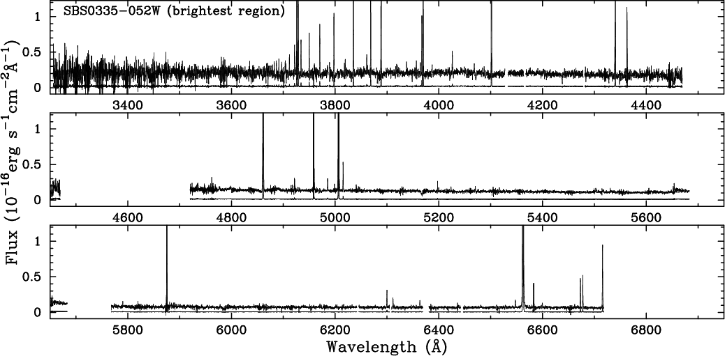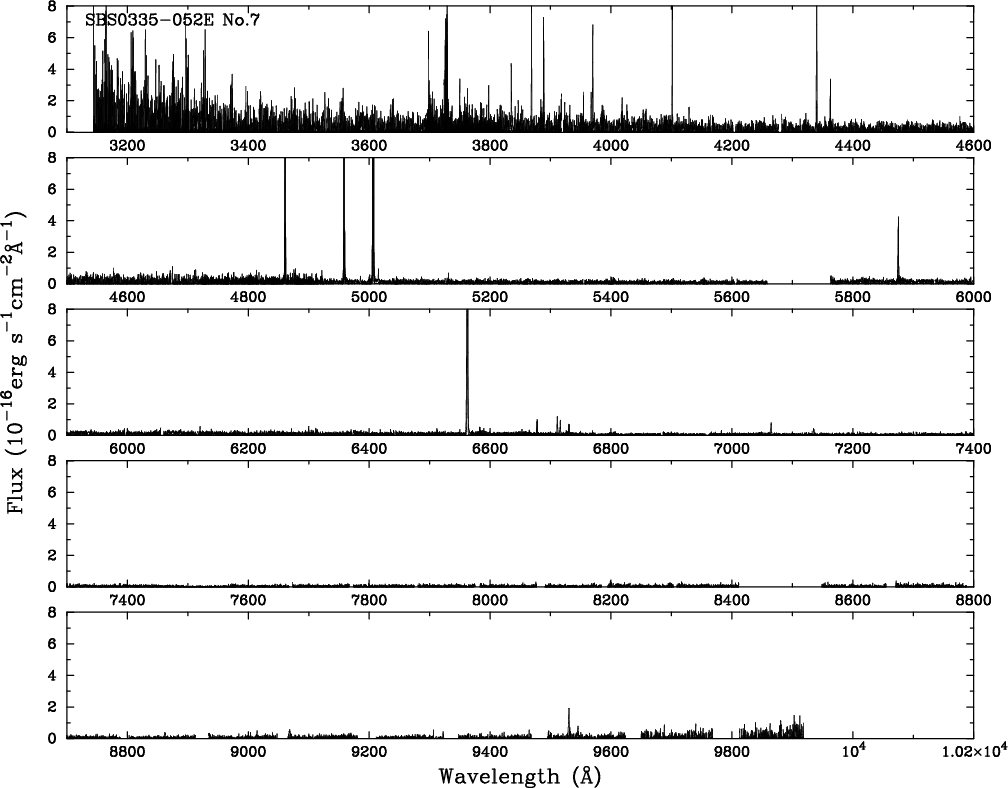 7, simultaneously crossing the brightest H II region in SBS 0335-052W (Fig. 1, left). The spatial scale along the slit was 0