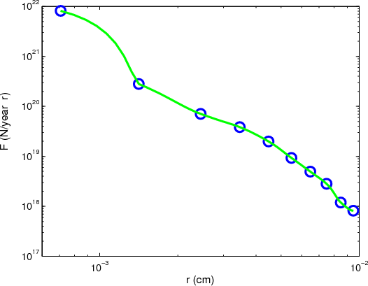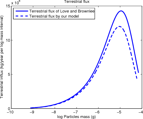Figure 1: Terrestrial flux calculated following the Love and Brownlee procedure using the two differen average velocities of 16.9 km s-1 and 18.6 km s-1. |