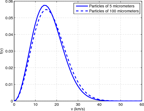 where f(v) is the velocity distribution of dust particles (s/km), and h(m) is the mass distribution function of the impacting particles (