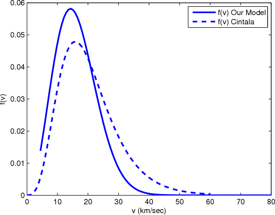 Figure 3: Comparison of velocity distribution given by our model and Cintala's model. |