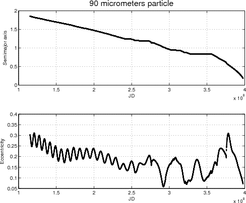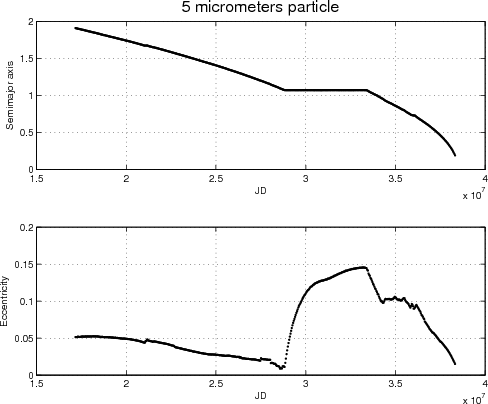 Before impacting Mercury the lifetime of dust particle strongly depends on their radius and mass. In our simulations, we find that the lifetime of dust grains increases with their radius and this is a consequence of both a slower drift rate caused by P-R drag and resonance trapping. However, the lifetime is not a trivial linear function of the size since the interplay between planet scattering and resonances strongly affect the eccentricity, which is relevant in determining the drift rate produced by the P-R drag. In Figs. 5 and 6, we show some examples of resonance trapping for different size particles. During the resonant evolution it is noteworthy that the eccentricity of the particle increases leading to a much faster orbital decay once out of the resonance. Large particles are trapped more frequently and their eccentricity is, as a consequence, often increased accelerating their migration towards Mercury. Accounting for all these dynamical effects is possible only with a full numerical approach.