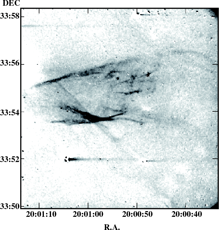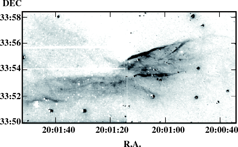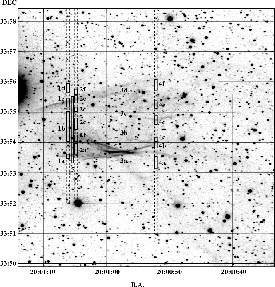 filaments to the west, while the second focused on the diffuse [O III] emission to the east. All fields were projected to a common origin on