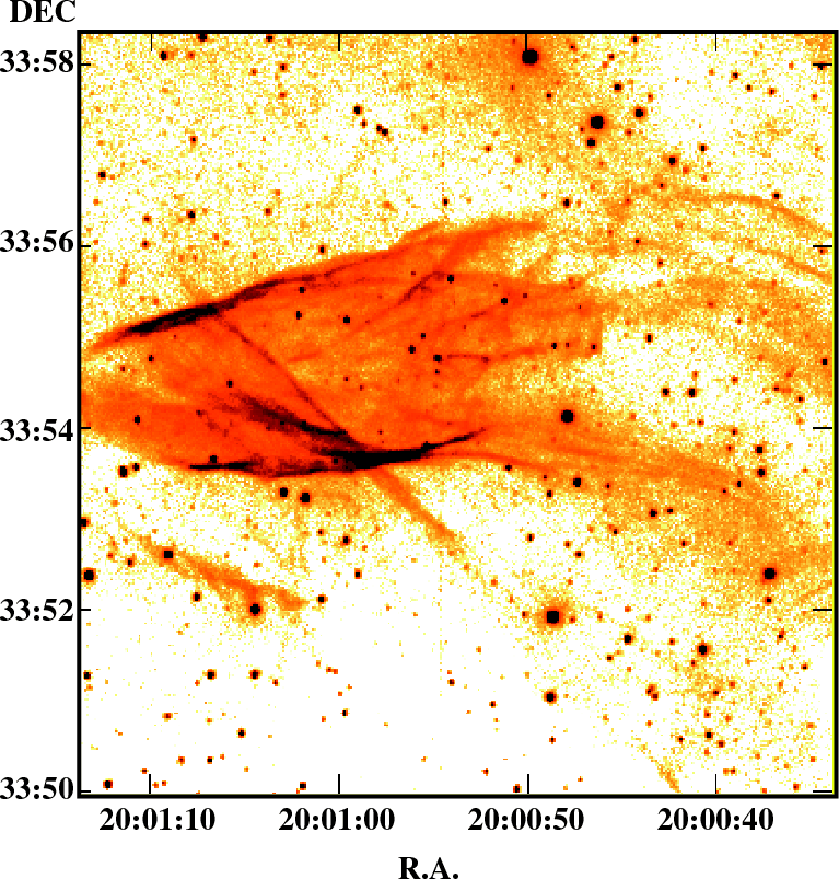The motions of the filaments as seen in Fig. 5 also suggest an evolved SNR origin. The line profiles are single over the bright filaments, where expansive motions are expected to be tangential along the line of sight, but become split, albeit by only a few tens of km s-1 towards the fainter regions.