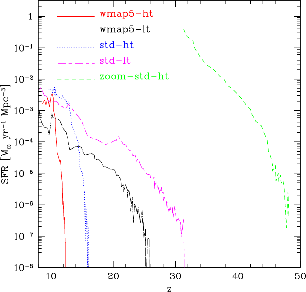 -31, depending on the adopted cosmology. In these models, stars are formed automatically when the gas density increases above the adopted threshold, regardless of the time between the moment when the threshold is reached and the effective runaway collapse. While this is a reasonable approximation at low redshift, at high redshift this time interval represents a significant fraction of the Hubble time and thus this assumption can induce large artificial offsets to the onset of star formation. Choosing higher density thresholds (