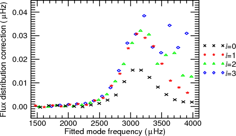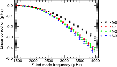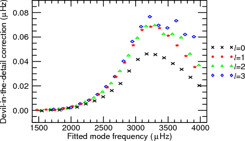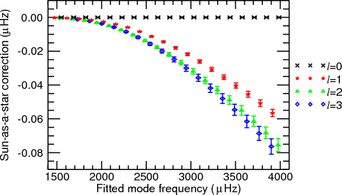 Figure 7 shows the Sun-as-a-star corrections applied to the 8640-d BiSON data set. As can be seen, except for l=0 modes these corrections are similar in magnitude but opposite in sign to the devil-in-the-detail corrections. As the variation with frequency is different for the two different corrections it is still necessary to use both when examining the frequencies observed in long time series. The correction to the l=0 modes is zero as there is only one component to observe and by definition this is the centroid frequency.