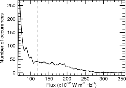 the 8640-d time series examined by Broomhall et al. (2009). The solid line shows the flux distribution and the dashed line indicates the mean flux of the complete time series once the BiSON window function has been accounted for (i.e.