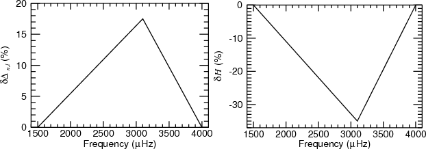 This is not the only effect that influences the final observed frequency. As mentioned, it is simplistic to assume that only the mode frequencies change with activity. In fact the heights and widths of the mode profiles also vary throughout the solar cycle and this means that the data observed at different epochs have varying contributions to the final peak profile. For typical low-l modes, as the surface activity increases the mode frequencies and widths increase but the mode heights decrease. Data samples from times when the mode is more prominent (i.e. at low activity levels) carry proportionately larger weights in the final peak profile than times when the mode is less prominent (i.e. at times of high activity). Therefore, data samples from times when the frequencies are lower carry proportionately larger weights in determining the final peak profile and so the final observed frequency is biased towards a lower frequency than would be observed in an unweighted mean. The size of the effect is dependent on the comparative time variations in frequency and power.