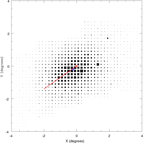 the projected X and Y coordinates. The data are binned in 0.2 degree bins on both the axes and