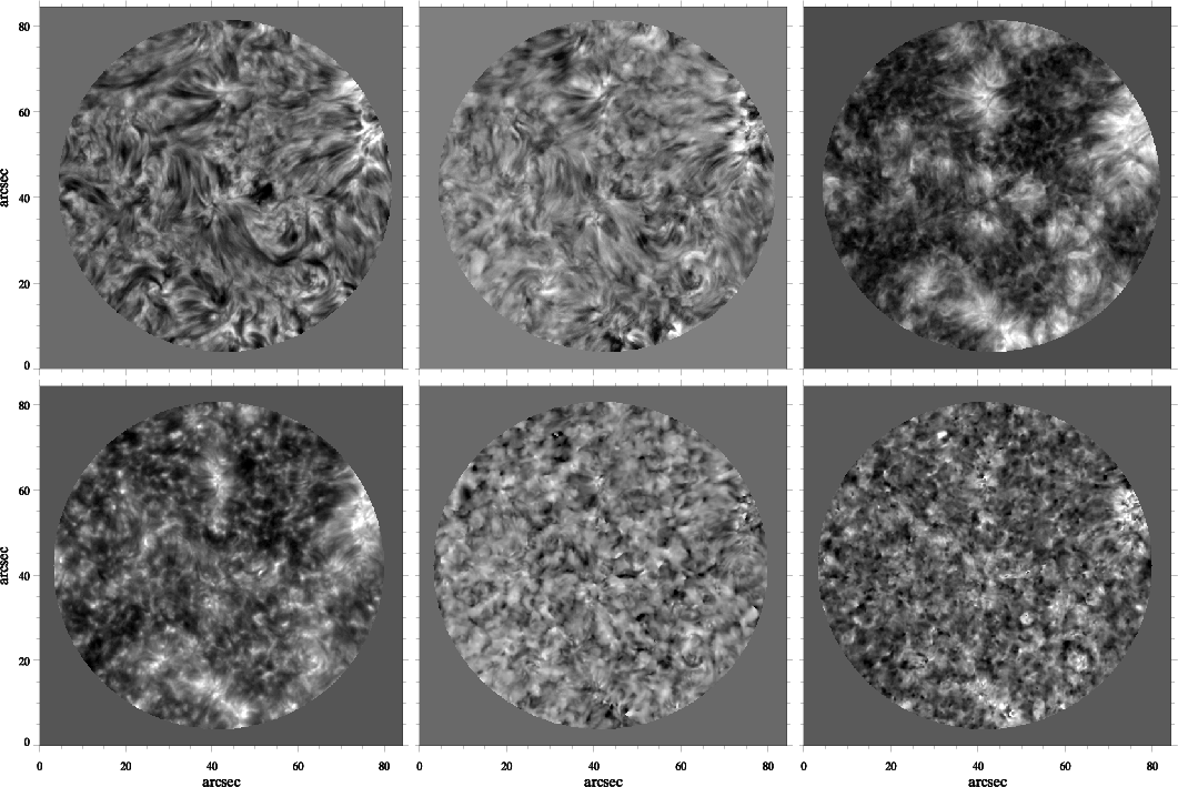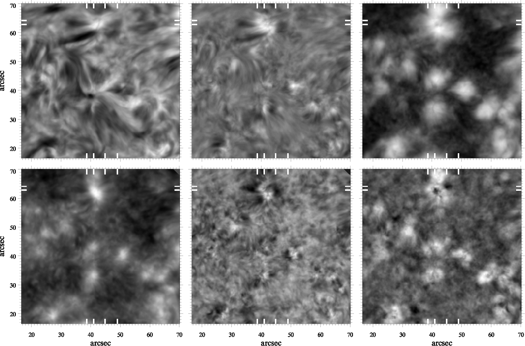 dramatically in their portrayal of the solar atmosphere. The corresponding scatter diagram (first panel of the second row in Fig. 6) indeed shows a total lack of brightness correlation between the two, except for the very brightest pixels. The H image shows masses of bright and dark chromospheric fibrils, sometimes with marked brightening towards one end. Comparison with the magnetograms in Fig. 1 shows that these bright endings correspond to the stronger magnetic concentrations, but the magnetic network pattern cannot be recognized directly from the H