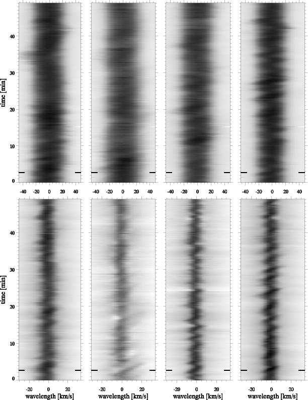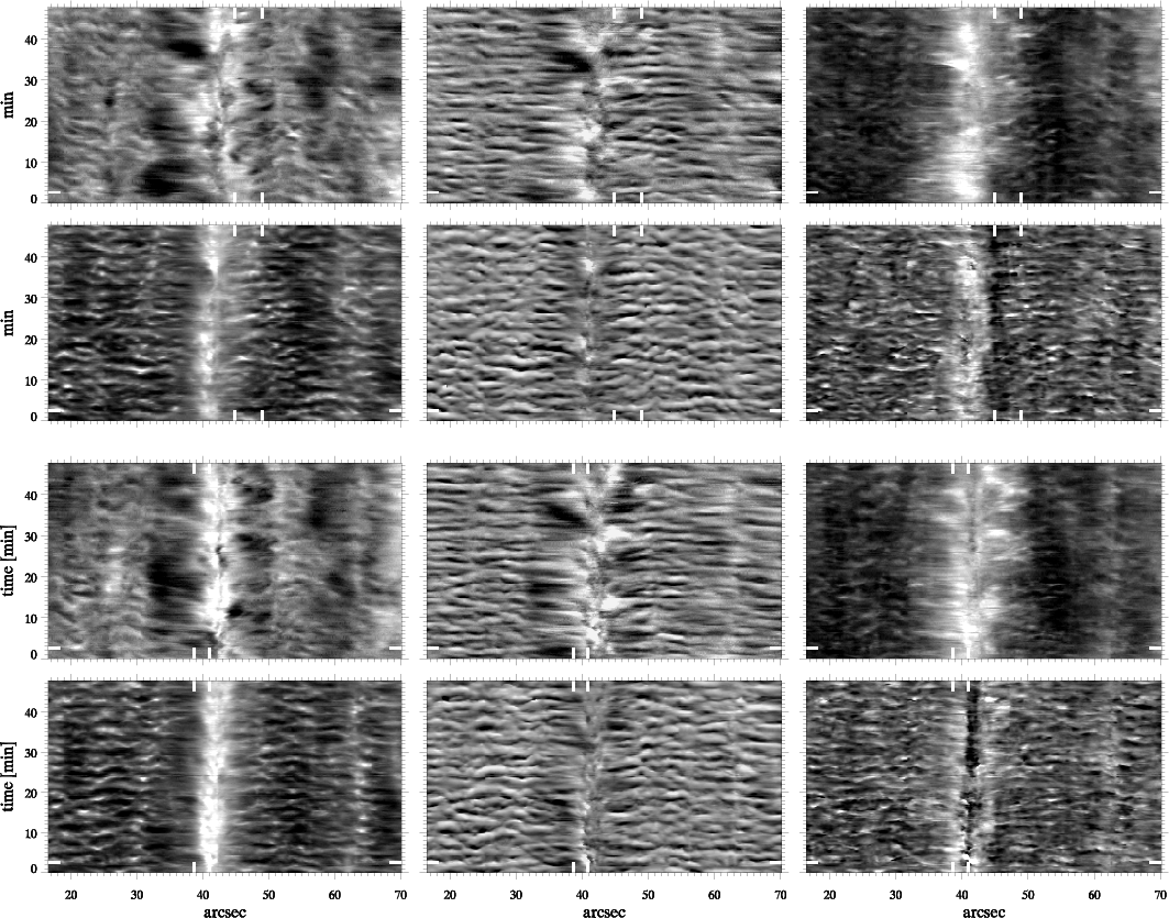 Figure 5: Space-time slices showing temporal behavior along the two cuts in the x-direction that are defined in Fig. 4 by white horizontal markers along the y-axes. The upper half of this figure corresponds to the higher cut. The six panels per cut show the same quantities as in Figs. 3 and 4. Each panel is bytescaled separately, the Dopplershifts symmetrically with respect to zero. The white markers along the spatial axes specify four pixels, two per slice, for which the spectral profile evolution is shown in Fig. 7. The white markers near the bottom of the time axes specify the moment of observation of the profiles in Fig. 2 and the parameter displays in Fig. 3. |
