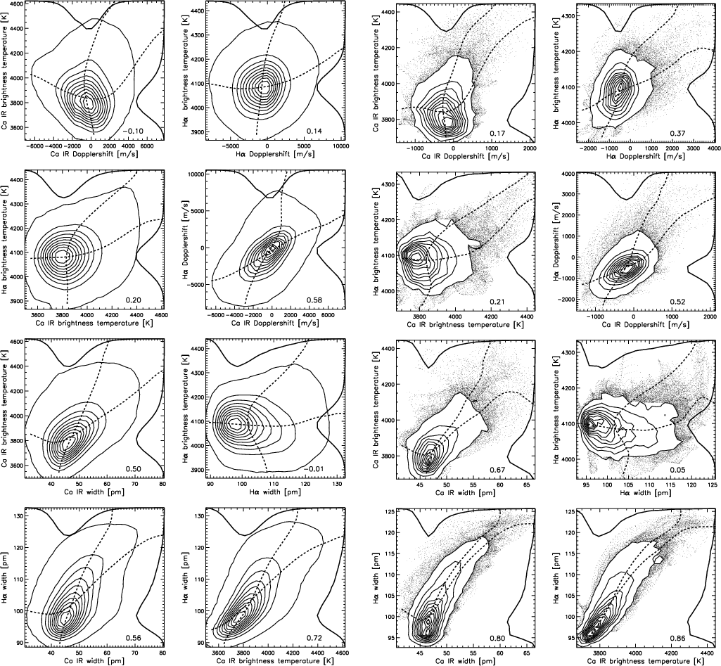 Figure 3 shows our measurements from a single profile scan of the two lines, taken at 17:52:34 UT during one of the best-seeing moments. For each line the measurements are as specified in the previous section: the intensity of the line profile minimum expressed as brightness temperature, its Dopplershift, and the line core width defined as in Fig. 2. We describe them column by column, comparing each panel with pertinent other ones. These comparisons are quantified in the form of pixel-by-pixel correlation diagrams in the lefthand part of Fig. 6, which we describe in parallel. The diagrams are constructed from 66 spectral sets taken during very good seeing to obtain the best statistics. The caption explains the format, while the axes provide the numerical ranges of the greyscale variations in Fig. 3. The innermost contours of the diagrams in Fig. 6 represent the maxima of the overall distribution, while the curves on the top and right of each figure show the distribution of the relative quantity on each axis.
