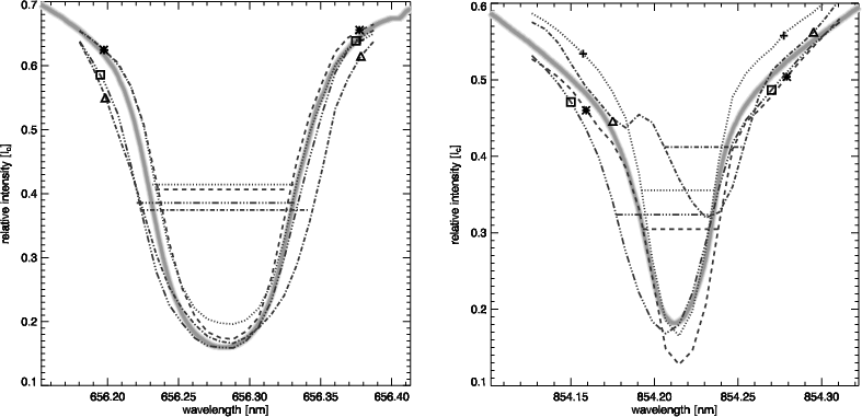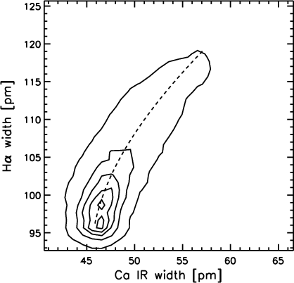 Note that such core width behavior cannot be reproduced by specification of a deeper temperature rise as done by Fontenla et al. (1993). Their A, C, ..., F and P models were designed to represent progressively hotter chromospheres in quiet cell interior, average quiet sun, network, and plage by placing the chromospheric temperature rise at increasingly larger column mass. However, when measuring with our method the line widths from profiles synthesized in NLTE (as in Fig. 8), this sequence produces smaller core width with increasing activity instead of the actual core-width increase we observe.