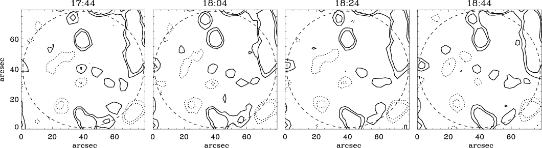 Figure 1: Magnetic field evolution for the IBIS field of view (dashed circle), from GONG data at http://gong.nso.edu, at 20-min intervals. The time of observation is specified at the top of each panel. The IBIS run was from 17:50 to 18:40 UT. The contours show the apparent magnetic flux density at values of 10 and 20 Mx cm-2, for positive (solid) and negative (dotted) polarity. |