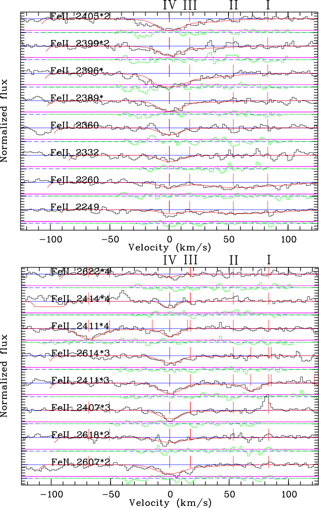 2249) are not and can guide the fit in identifying the wavelengths of the components. A four-component model represents a good fit for the FeII lines. Thus, the redshifts of these components as well as the Doppler parameters were fixed to fit all the saturated FeII and other ion features present in the spectrum with the same model.