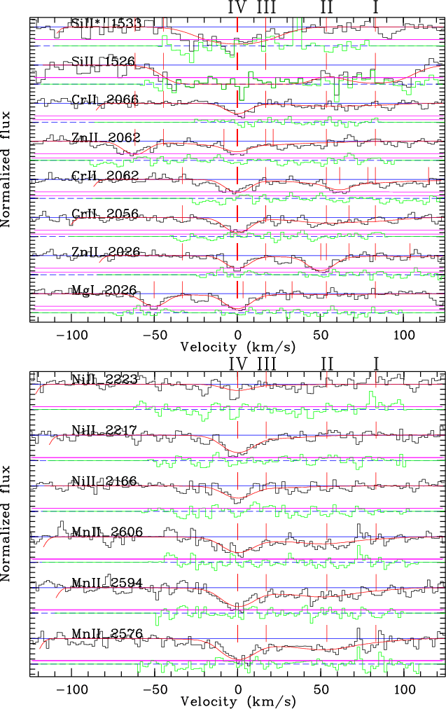 Figure 2: The MgI, ZnII, CrII, SiII ( top panel), MnII, and NiII ( bottom panel) absorption features. Solid lines represent our best-fit model. Vertical lines identify the velocity of each component with respect to the zero point arbitrarily placed at the redshift of the bluemost component (z=1.5115). Bottom, solid lines mark the fit residuals. |