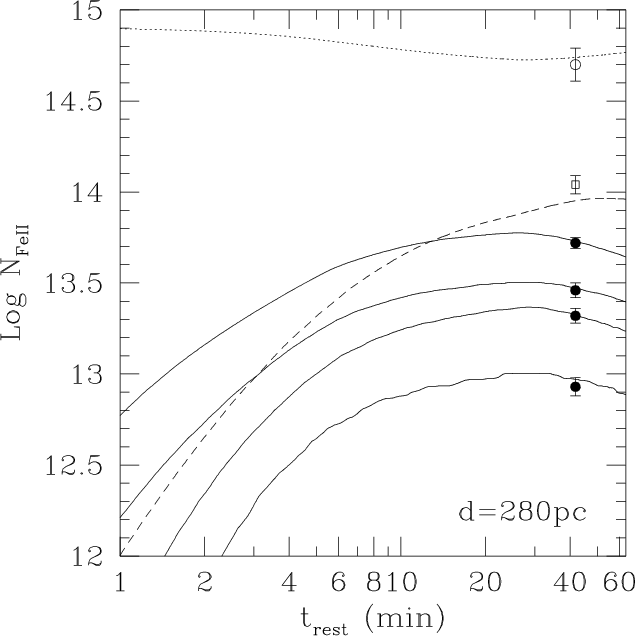 the GRB explosion and the UVES observation. The time of observation (with respect to the GRB detection) is defined as the logarithmic mean between the beginning and the end of the observation. The agreement between the theoretical curves and the data is very good. The distance of component IV from the GRB explosion site is measured to be d=280 pc. To estimate the error associated to d, we ran our code for a grid of distances in the range 50-800 pc. We then converted the column densities and the corresponding errors to linear values to compute the