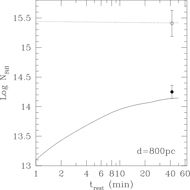Figure 5: The column densities for the ground level of SiII (open circle) and fine structure transition for component IV in the spectrum of GRB 080330. Column density predictions from our time-dependent photo-excitation code are also shown. They refer to the ground level (dotted line) and fine structure level (solid line) transitions, in the case of an absorber at 800 pc from the GRB. However, this value should be considered as an upper limit (see text for details). |