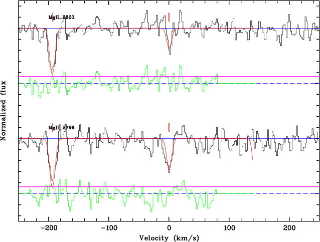 200 km s-1, they should be interpreted as a single, clumpy system (Fig. 6). The third absorber is rather complicated. The absorption lines detected for this system are the MgII