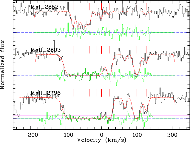 2852 line. This system has a complex structure and a single Voigt profile is not adequate to reproduce it. At least five different components are needed to obtain a good fit to the MgII data. The bluemost component is saturated, and so a reliable column density for the MgII cannot be obtained. However, this is the only component that exhibits MgI absorption at the 90% confidence level. This MgI component needs a more complex modeling to adequately follow its profile. This results in a further division into six subcomponents (Fig. 7). Taking into account the velocity spread of