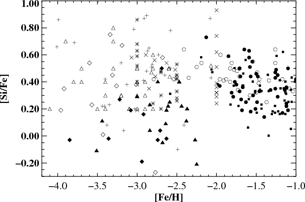 - The [Si/Fe] ratios are overabundant for metal-poor stars, and there is an indication that [Si/Fe] slightly decreases with decreasing metallicity.