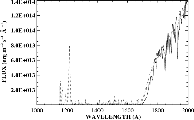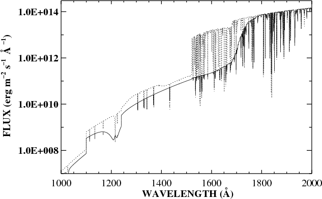 The UV flux emerging from MAFAGS-ODF model for HD 84937 without (dashed line) and with (solid line) the Ly |