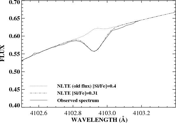 - the 4102 Å line is also important in determining the silicon abundances of metal-poor stars; it is necessary to take account of the NLTE effects, except for very cool and metal-rich stars. For warm metal-poor stars, the NLTE correction can reach more than 0.25 dex;