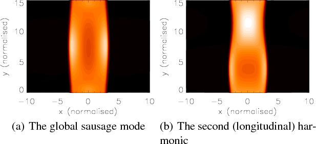 sausage mode was recently considered by Pascoe et al. (2009). It was established that the sausage mode continued to be supported despite variations in the loop cross-section. It was also shown that the characteristic periods of the global mode and higher harmonics were effected, but weakly so. A similarly small variation in parameters was found when investigating the effects of twist in loops (Erdélyi & Fedun 2006).