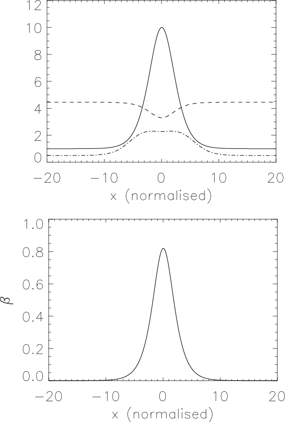 Top panel: plot of the normalised initial parameters as a function of the transverse coordinate. The solid line is the density, the dashed line is the magnetic field By, and the dot-dashed line is the temperature. The temperature has been multiplied by a factor of 5 for clarity. Bottom panel: the |
