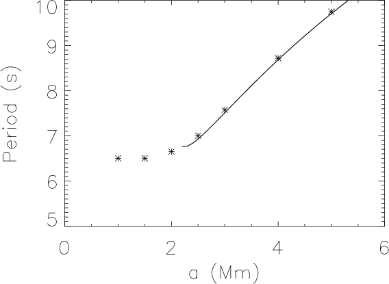 The period of the sausage mode should also depend on the loop width a. This is due to dispersion, since a change in a essentially corresponds to movement along the dispersion curve derived from Eq. (5) and hence a change in phase speed .