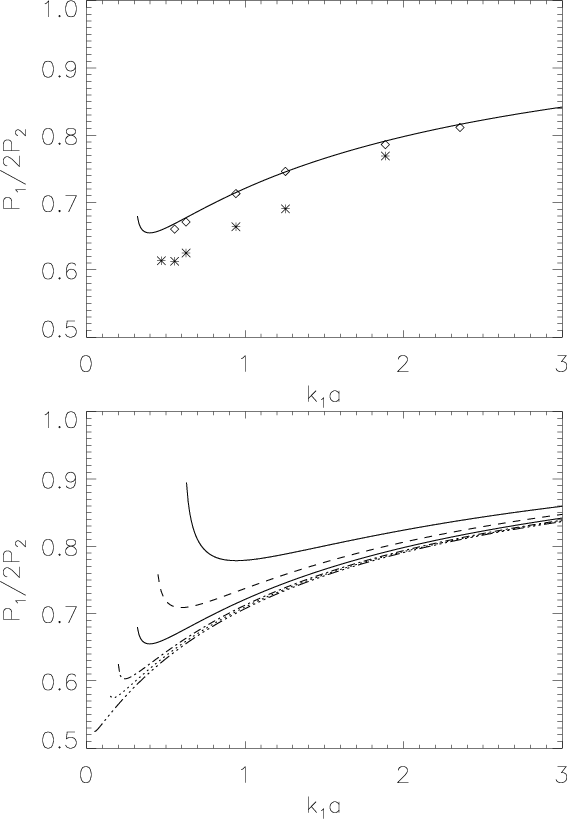 For non-dispersive waves, the expected ratio of P1/2P2 is 1. It is clear that the sausage mode harmonics do not follow this pattern. For large values of k1 corresponding to the uniform plasma (and hence dispersionless) limit, the ratio does indeed tend towards the ideal value. However, for smaller k1, the period of the second harmonic becomes a much greater fraction of the fundamental period, as illustrated in both panels of Fig. 6. The top panel shows the quantitative difference between simulations of an Epstein profile (diamonds) and a step-function profile (stars). Although this deviation is noticeable at low k1 values, the overall behaviour remains the same, as expected. The solid line shows the theoretical curve for an Epstein profile derived from the dispersion relation given in Eq. (5), corresponding to the zero-