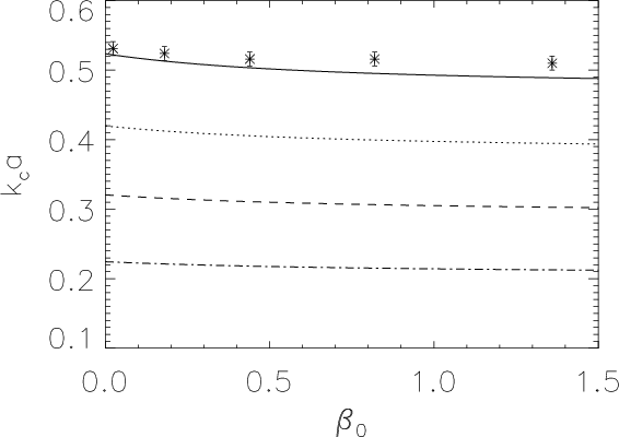To measure the cut-off wavenumber itself, we simulate the global mode for varying L (and hence k) and examine the time series of the loop anti-node as described in Sect. 3. Here the criterion for a mode to be leaky is that the amplitude of the oscillation inside the loop is damped. When far into the leaky regime, the damping effect is strong and evident (see for example Pascoe et al. 2007b). However, closer to the trapped regime it can be difficult to ascertain whether significant damping is taking place. This effect is mitigated by running the simulations for a sufficiently long time. However an exact determination of the cut-off wavenumber