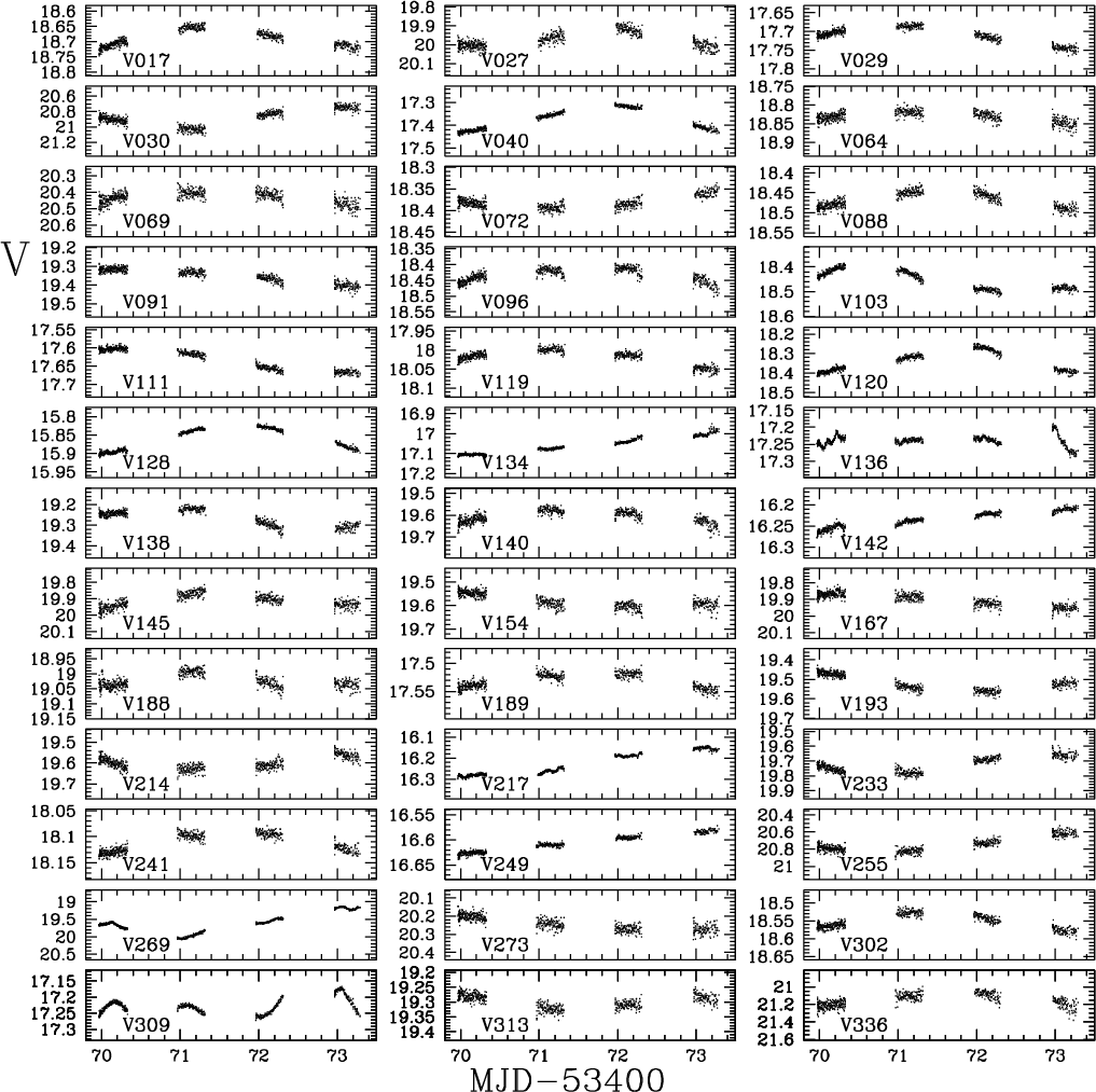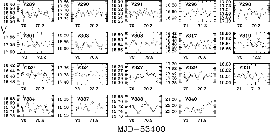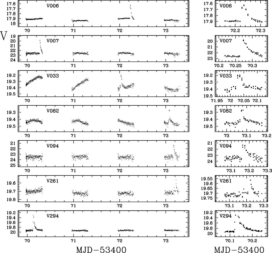 Light curves of seven stars with flares are shown in Fig. 15. Table 1 summarizes the photometric information about these stars. The amplitudes of flares in the cases of V007 and V094 are larger than 2.0 mag, while in the other five cases they are smaller than 1.0 mag. The fading part of the flare in V294 shows a kind of knee. Star V033 is periodic with P=1.1625 d (the phased light curve is shown in Fig. 12).