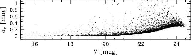 Figure 2: The photometric errors for 12 571 stars from the VIMOS quadrant A2 plotted as a function of V magnitude. |