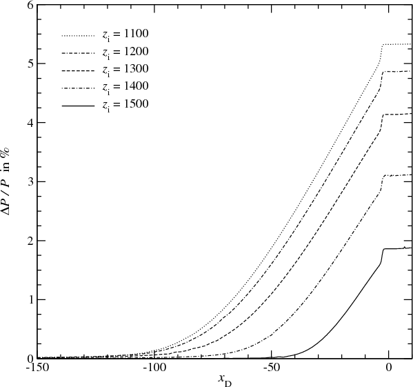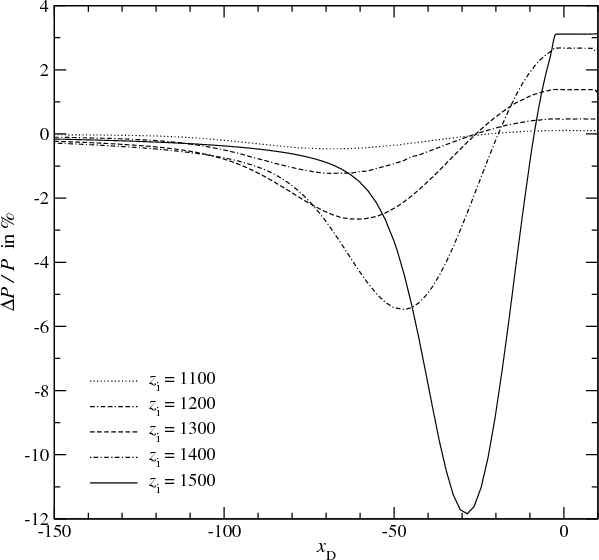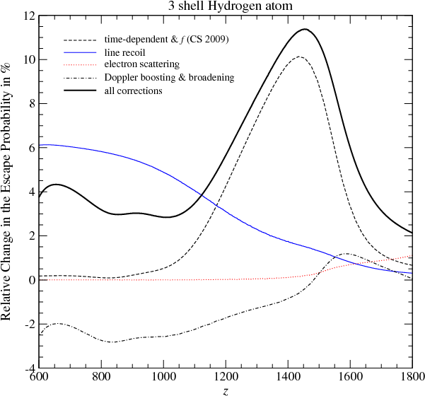 Finally, we also ran the code including the correct shape of the 3d/3s-1s emission and absorption profile (Chluba & Sunyaev 2009a). The results of these computations are shown in Fig. 10. The dashed line again shows the correction in the no-scattering approximation (Chluba & Sunyaev 2009a). The dotted line in addition indicates the correction that was associated with the effect of the emission profile in the no-scattering approximation (Chluba & Sunyaev 2009a). We also computed the pure profile correction using the numerical results obtained when including the redistribution of photons to obtain the dash-dotted curve. As one can see the difference to the no redistribution case is very small. Therefore we did not compute the pure recoil correction, the line diffusion correction, or the correction due to electron scattering, since they should also be very similar to the contributions shown in Fig. 9.
