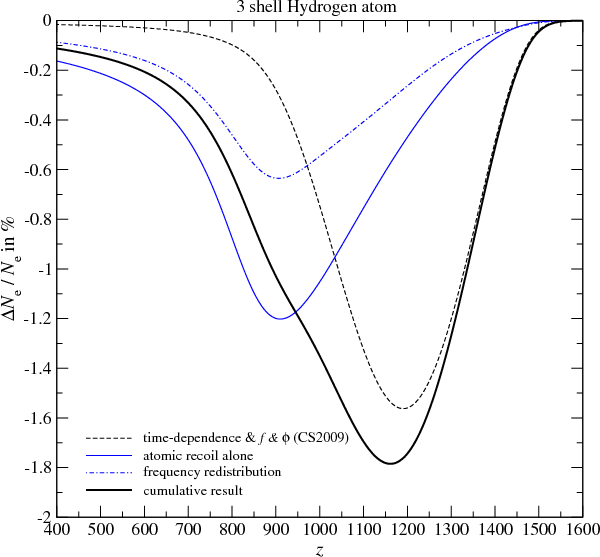 as obtained for the different processes discussed in this paper. In Fig. 12 we show the corresponding correction in the free electron fraction computed with the modified version of R ECFAST. The atomic recoil effect alone (thin solid line) leads to