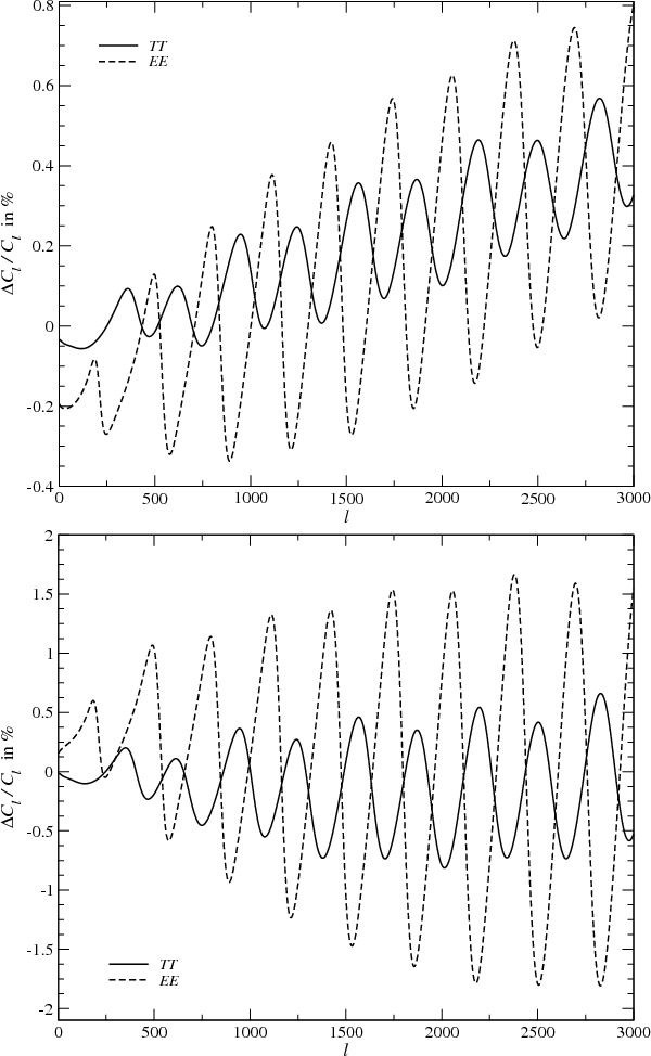 In Fig. 13 we finally show the changes in the CMB temperature and polarization power spectra. The corrections to