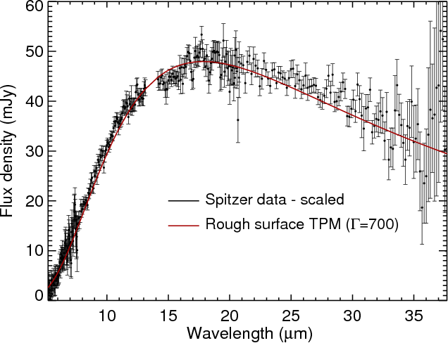 When the reduction was completed, we found a discrepancy of 10% between the fluxes of overlapping wavelengths in the SL and LL orders, which is equal to the expected uncertainty in the absolute flux calibration (Houck et al. 2004), and small offsets like this one are not unusual. We scaled the LL and SL fluxes to match each other in the overlapping wavelengths, the SL flux by 1.05 and the LL by 0.95, and we include this 10% systematic absolute calibration uncertainty in the modeled parameters discussed in the next section. This spectrum is plotted in Fig. 1 along with the best-fit thermophysical model (TPM, Sect. 3).