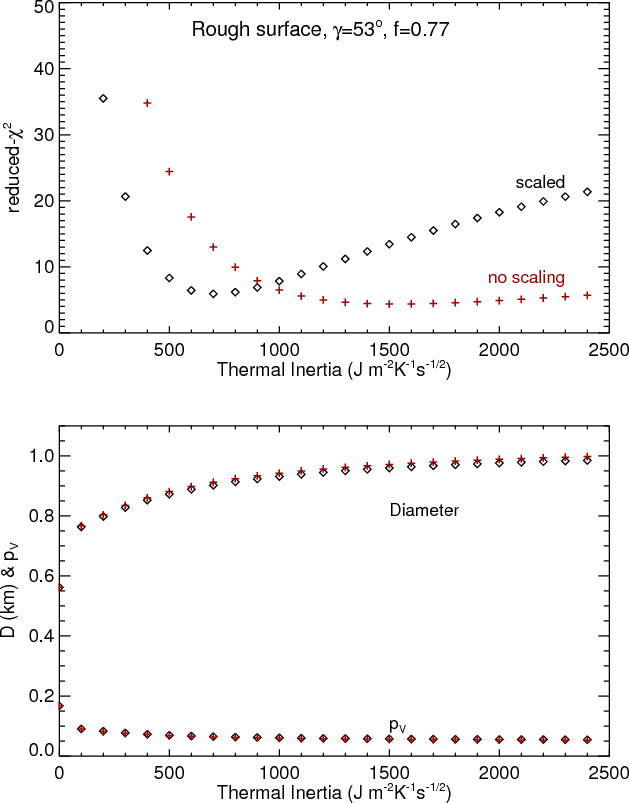 vs. thermal inertia and the estimated diameter and geometric albedo vs. thermal inertia for the rough-surface case (the parameters for the rough-surface model are