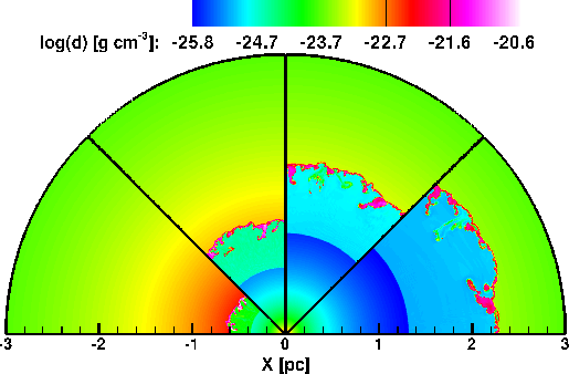 -direction. The number of grid cell in the radial direction was always equal to 1000. The physical size, in the radial direction, of the grid in the pre-supernova evolution simulations was ranging from 0 to 3 pc, and the grid cells were equally spaced over this range.