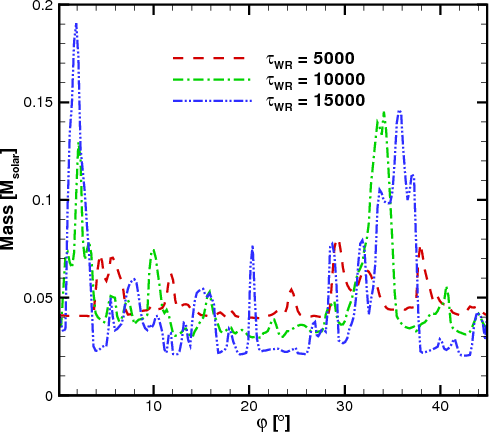 Figure 5 shows the mass histograms for the SN ejecta for all models. The unshocked, freely expanding ejecta are visible as a horizontal line in the histograms. Similar to what was seen in the shocked CSM distribution, the shocked SN ejecta of Model WR0 span a much smaller range in velocities compared to the shocked SN ejecta of the models with a WR phase. Also similar is that the range of velocities seen in the shocked SN ejecta increases with a longer WR life time.