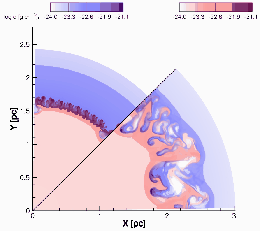 Figure 6: Radiative energy loss of the CSM (blue) and SN ejecta (red) components of the SNR Models WR0 (first slice) and WR15 (second slice), 335 years after the supernova explosion. The energy loss is calculated by using the MacDonald & Bailey (1981) cooling curve. The second slice clearly shows that due to the clumped structure of the WR shell the majority of radiating material consists of shocked CSM. The fingers due to the Rayleigh-Taylor instability in the first slice show emission from both shocked CSM and shocked ejecta. |