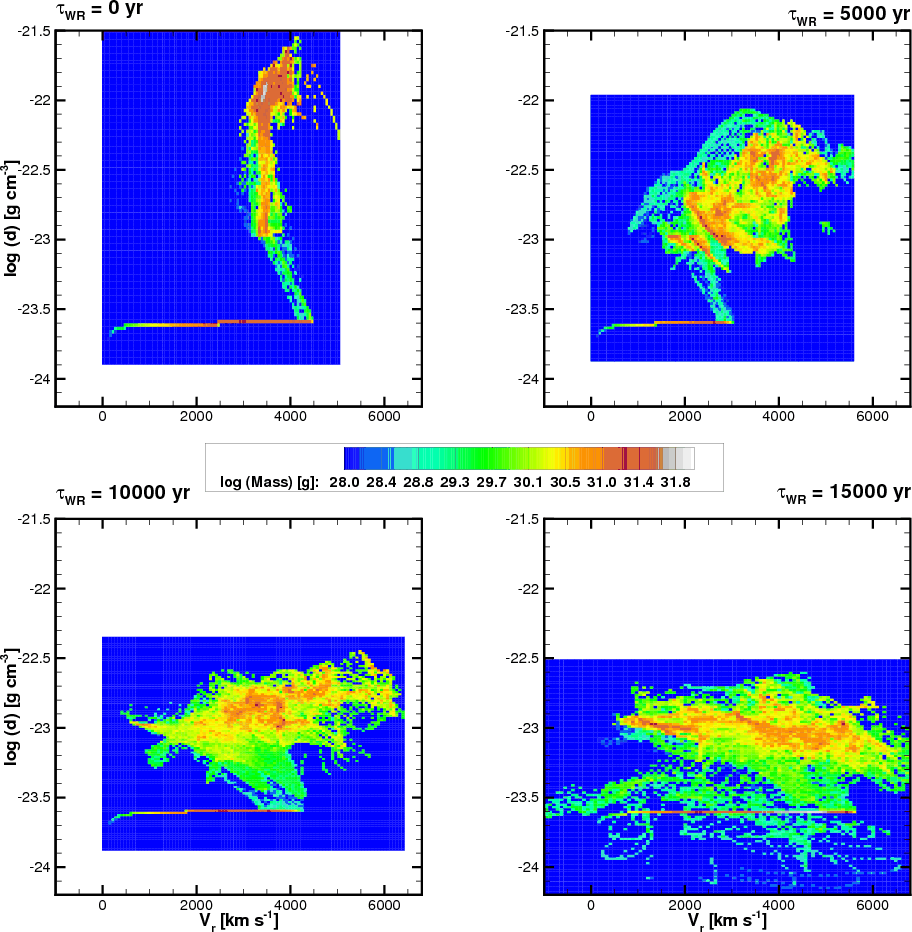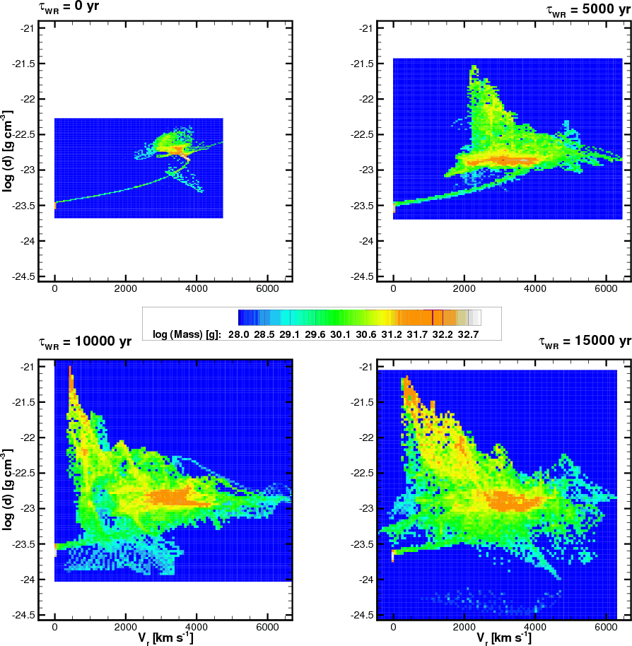 All the other mass histograms still show the unshocked CSM as a high peak in mass at zero velocity and low density, but the shocked material is spread out over a much larger range in velocities, due to the violent interaction with the WR shell. It can also be seen that the range of velocities seen in the shocked CSM becomes larger with increasing WR life time. This is due to the increasing amount of mass within the WR shell for a longer WR life time. Another apparent component in the lower two histograms is the slow moving, highest density material which corresponds to the high density clumps in the remnant. Model WR5 does not show this feature but the remainders of the WR shell remain visible even in that model, as we will discuss below.
